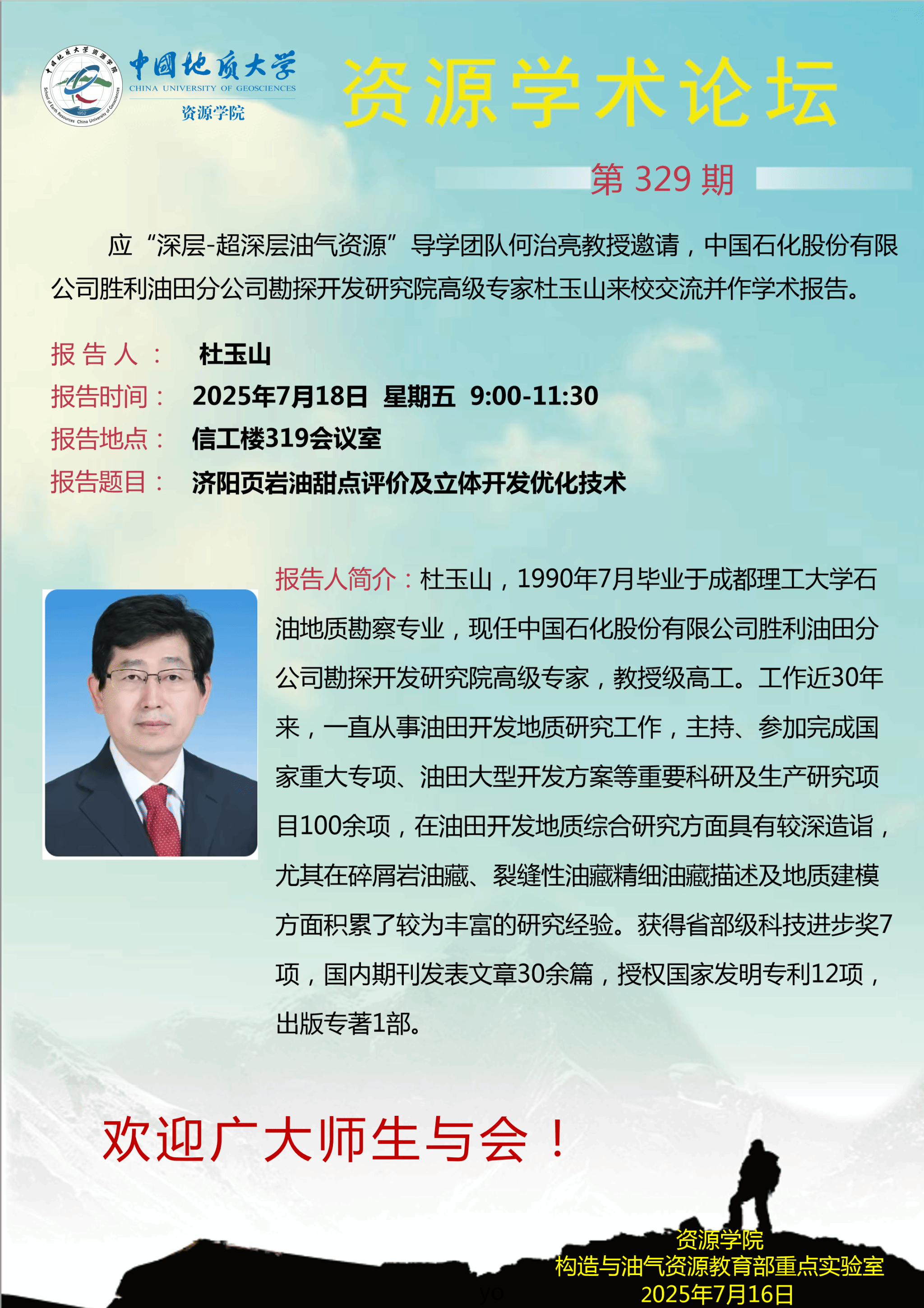 【7月18日】第329期资源学术论坛:杜玉山学术报告